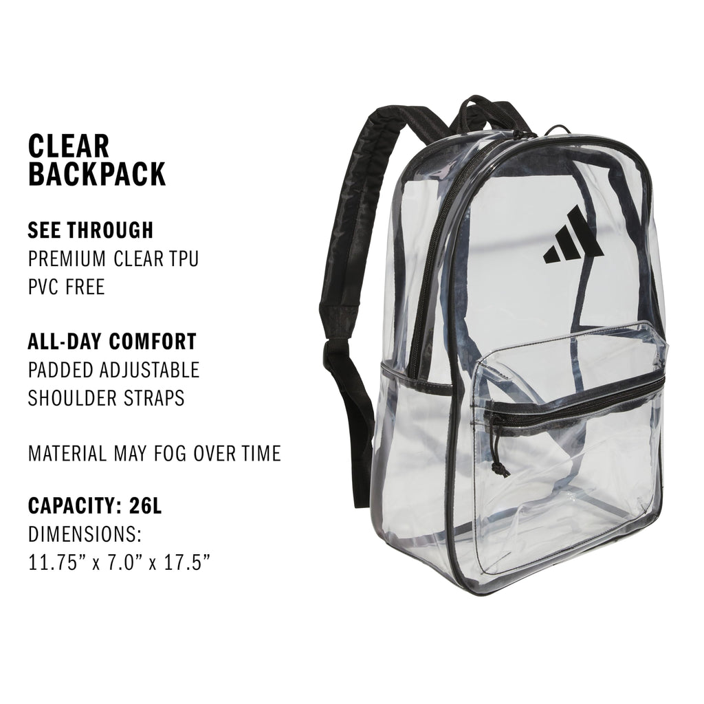 Brand: adidasColor: Clear/Black/2.0Features: Premium clear TPU material PVC free Large main compartment to hold all your gear Padded shoulder straps for extra comfort Material may fog over time model number: 984263Part Number: 5159835Details: Description Find what you need at a glance, from your gym tee to your notebook. This clear...