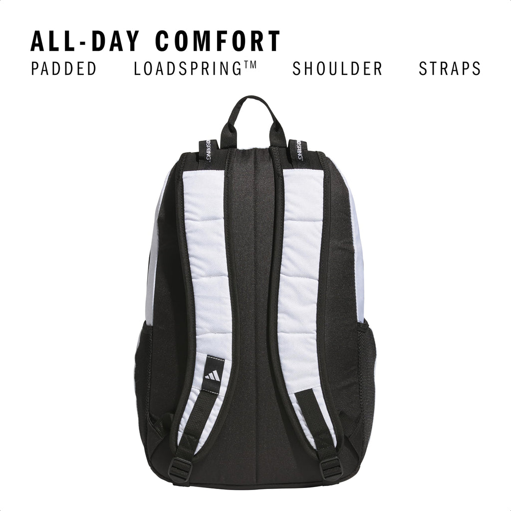 Brand: adidasColor: 7.0/Twill White/BlackFeatures: LoadSpring shoulder straps help ease the weight with these travel laptop backpacks Lifetime Warranty - built to last; this backpack with lots of pockets is suitable as a work backpack or gym backpack Wipe-able material for easy spot cleaning with soap and water; this adidas backpack...