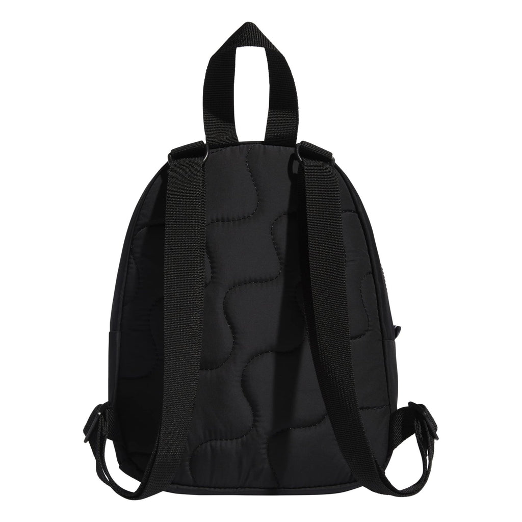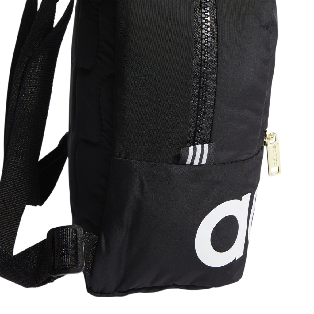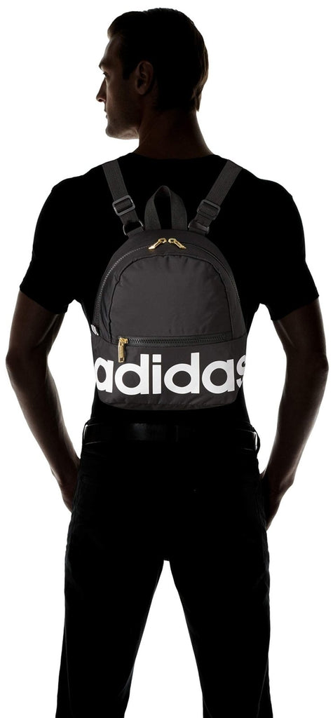 Brand: adidasColor: Black/White/GoldFeatures: Compact design Bold linear screen printed logo Front zippered pouch pocket for small items Quilted padded back panel Premium plastic main zipper model number: 978253Part Number: 5149668Details: Description Live and breathe sport. Bold adidas lettering and traditional 3-Stripes style come together in this soft mini backpack. There's...