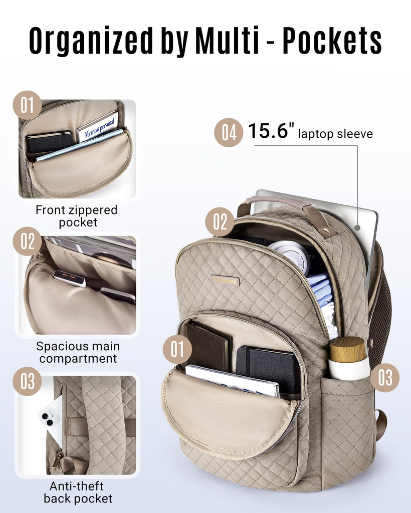 LIGHT FLIGHT Travel Laptop Backpack Women, 15.6 Inch Anti Theft Laptop Backpack with USB Charging Hole Water Resistant Casual Daypack Computer Backpack for Work, Warm Gray