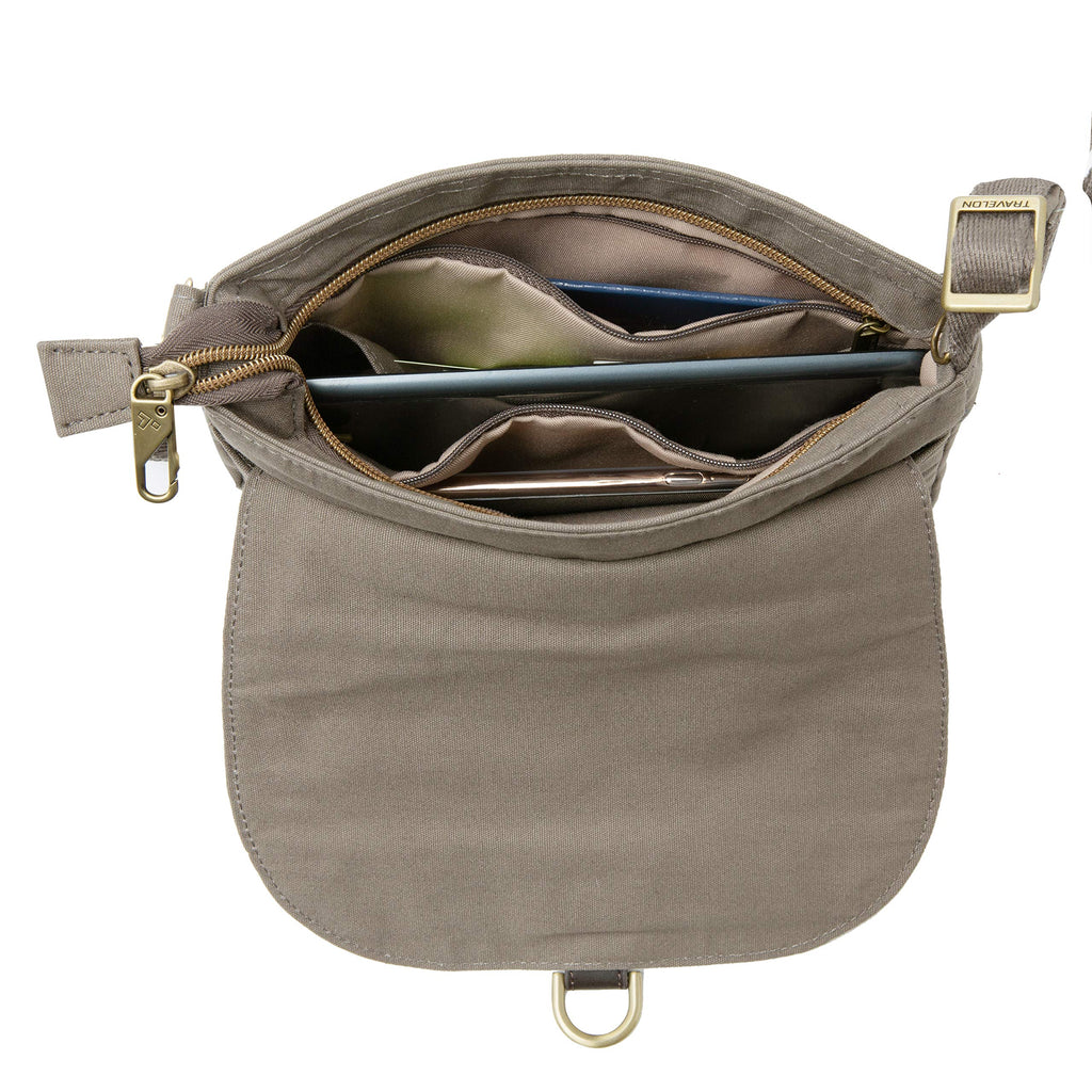 Brand: TravelonColor: StoneFeatures: ADD A HINT OF EDGE TO YOUR LOOK WITH THE TRAVELON ANTI-THEFT COURIER SADDLE CROSSBODY. AN EXCELLENT COMPANION TO A BUSY LIFESTYLE and is the perfect size when you only want to carry the essentials. The main locking zippered compartment features two zippered wall pockets; one is...