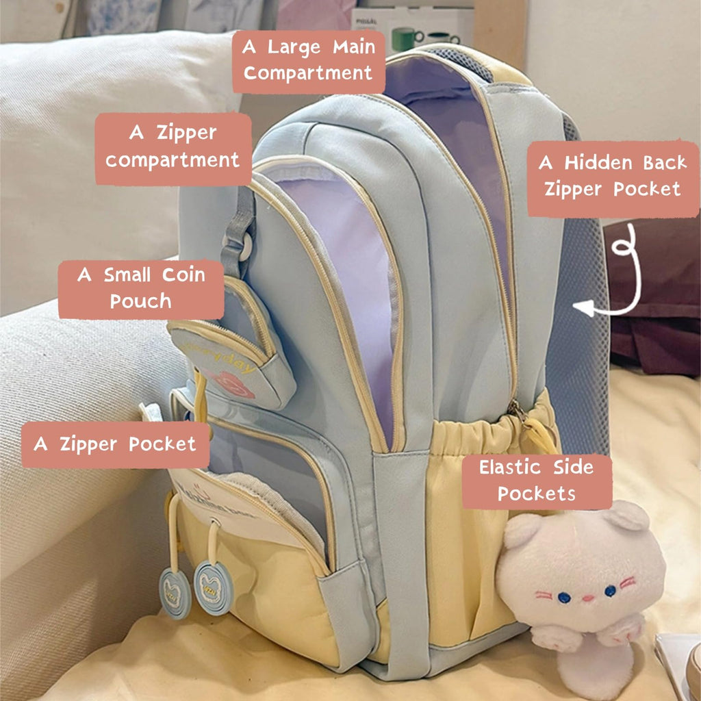 This cute cat charm backpack is the nice blend of playful style and practical functionality, ideal for daily use, daily commutes, and casual adventures. Made from durable, water-resistant nylon with a smooth polyester lining, the backpack is built to handle daily wear while keeping your belongings safe from light rain and spills. The ultra-lightweight design (only 1.19 lbs) prevents unnecessary shoulder strain, while the breathable padded straps ensure all-day comfort, even during long trips. With generous dimensions of 11.02"×7.09"×15.75", the backpack offers ample storage space organized into multiple pockets: a main compartment with a laptop sleeve that fits up to 15.6" laptops and A4 textbooks, front organizer pockets for stationery, elastic side pockets for water bottles or umbrellas, and a hidden anti-theft back pocket for valuables. The reinforced two-way zippers add durability and security, while the adorable plush cat charm and pastel color-block design add a fun, stylish touch to your daily look. Available in six vibrant colors, this versatile backpack is suitable for various daily activities, from daily use and work to casual outings and short trips. Whether you’re heading to class, running errands, or traveling, this lightweight, multi-functional backpack is a practical and stylish companion that balances cuteness, comfort, and durability.