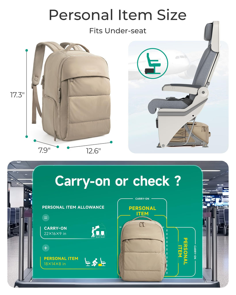 Brand: BAGSMARTColor: DesertFeatures: Ample Compartment: BAGSMART Travel Backpack provides generous room and diverse compartments, effortlessly segregate and store your 15.6" laptop, books, supplies. Meets airline carry-on requirements. Dimensions:17.3×12.6×7.9 inches Jewelry Safekeeping: Our carry on bag offers PVC pockets for jewelry storing, different sizes transparent pockets keep your belongings separated and...