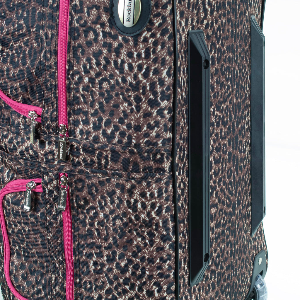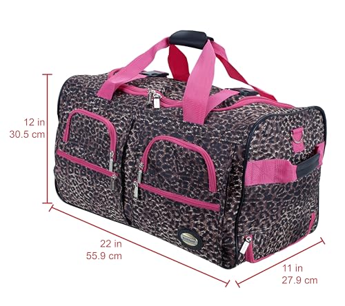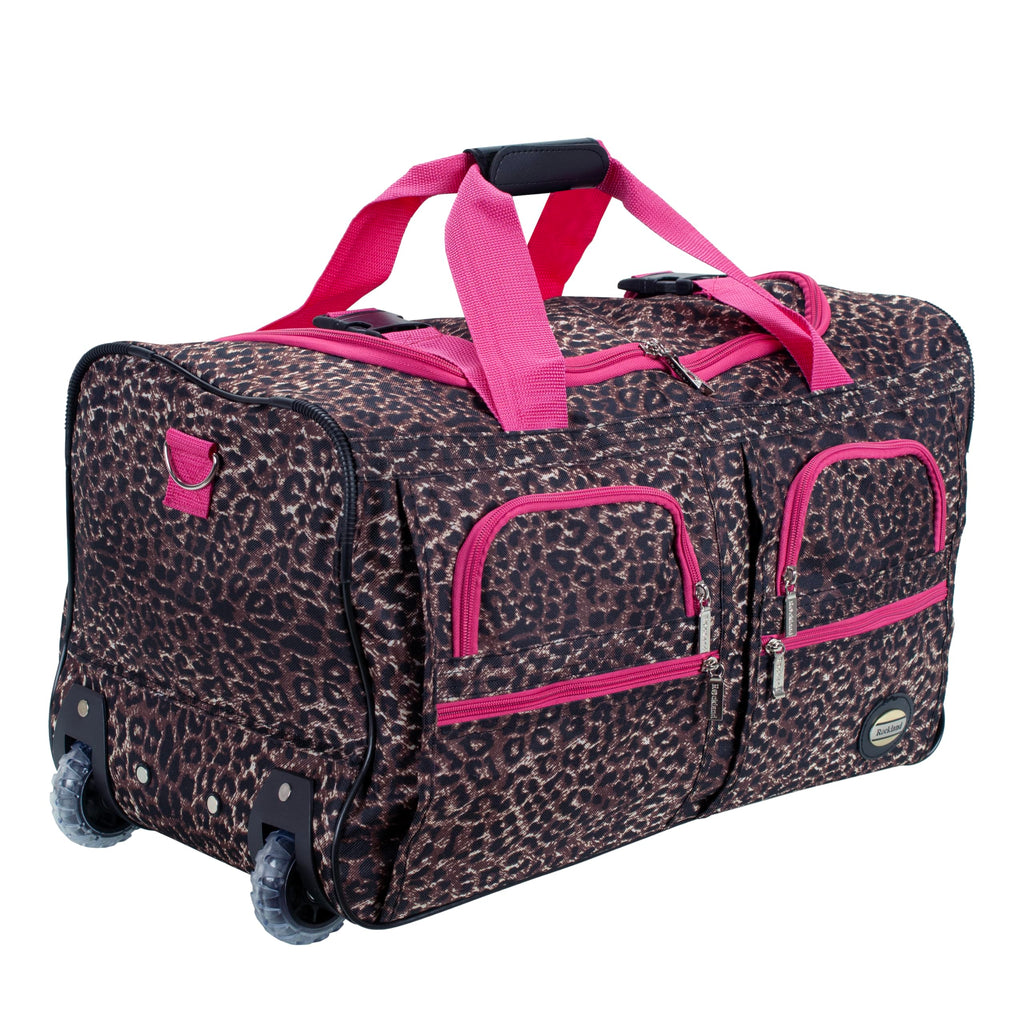 Brand: RocklandColor: Pink LeopardFeatures: Extra large wheels Heavy Duty Zipper Large u-Shaped top zip opening Four front pockets and Internal Handle 22"L x 12"W x 11"H Binding: Apparelmodel number: PRD322-PINKLEOPARDPart Number: PRD322-PINKLEOPARDDetails: Description Travel in style with this great soft-sided rolling duffle bag. Bag features a heavy duty polyester construction....