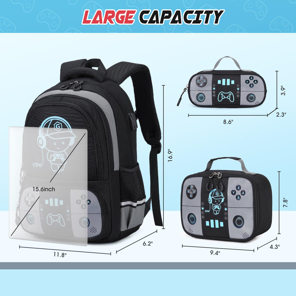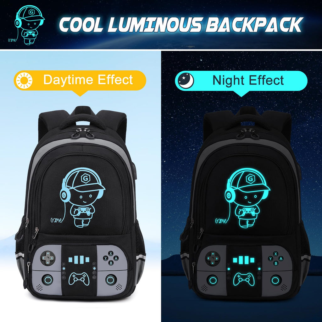 - 【Cool Luminous Gamer Boys Backpack Set】Perfect boys school backpack with insulated lunch bag and pencil pouch, meets all you need back-to-school! The eye-catching entire set glows in the dark after just 15 minutes of light exposure - backpack, lunch bag, and pencil pouch, adding a fun touch to your little gamer’s gear. Your child will love this trendy and functional backpack set, ensuring they stand out at school while keeping all their essentials organized!