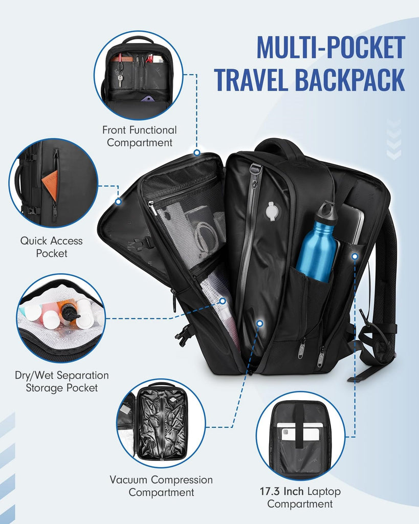 - Versatile and Organized: Everything in Its Place! Our travel backpack with vacuum system stay organized on the go with 4 main compartments: The main section is uesd for compressing clothes and maximizing space. The wet/dry pocket is suitable for storing your sweaty gym clothes or wet towels. The padded dedicated laptop compartment fits a 17-inch laptop, Keep it safe and secure. The hidden anti-theft back pocket can protect your passport, wallet & valuables. Pack smarter and travel lighter