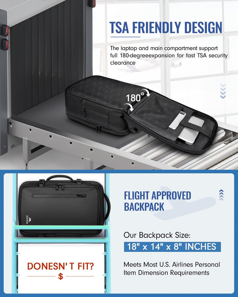 - As Personal Item Airline Approved: Avoid extra luggage fees! At 18”(H) x 14”(L) x 8”(W), this vacuum seal backpack travel meets most the U.S. airlines personal item size requirements such as Spirit, Frontier, EasyJet, JetBlue & more. It can be placed under seats & in overhead bins. TSA friendly 90-180° opening makes security checks a breeze. Practical, compact and ready for your next adventure