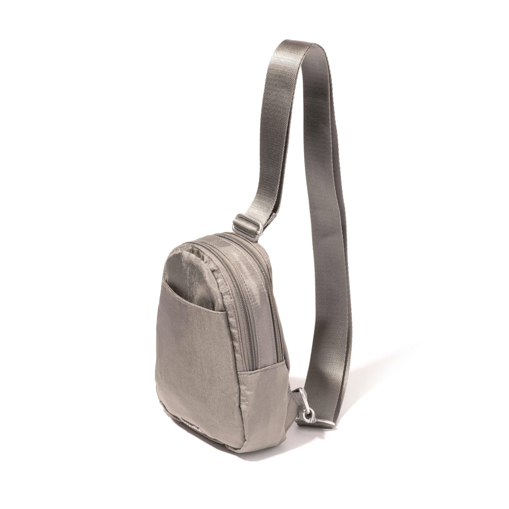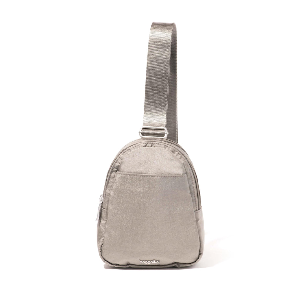 Brand: BaggalliniColor: Sterling ShimmerFeatures: STREAMLINED STYLE: Measuring 6.2"W x 8.4"H x 2.7"D and weighing just 8 oz, this lightweight travel sling bag was designed to work with you, not against you. CONVERTIBLE CONVENIENCE: Wearable on your left or right side, you can be sure this crossbody sling backpack is ready...