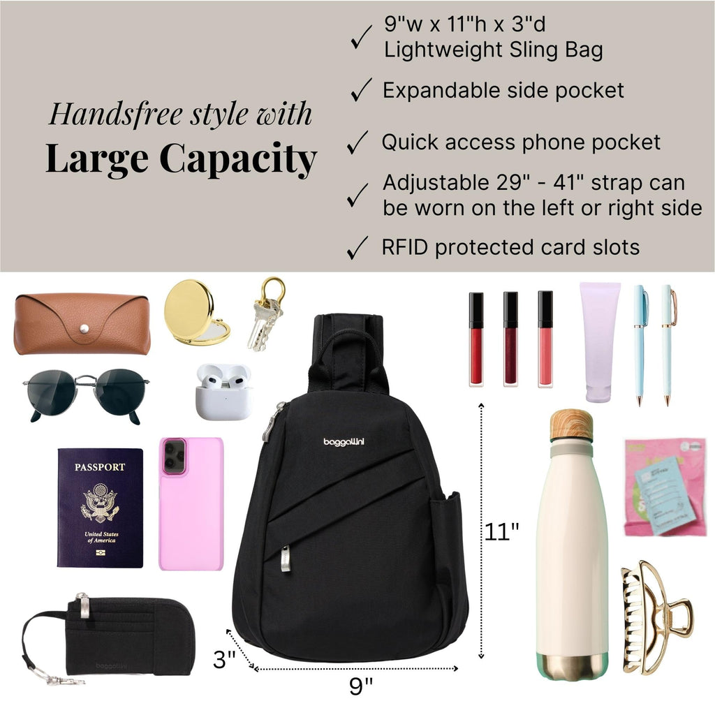Brand: BaggalliniColor: BlackFeatures: LIGHTWEIGHT DESIGN: Measuring in at 9"w x 11"h x 3"d and weighing just 11 oz, our crossbody sling bag is perfect for both travel and day-to-day use. The front and back zip pockets fit iPhone 15 and iPhone 15 Pro Max, and RFID blocking sleeves for cards...