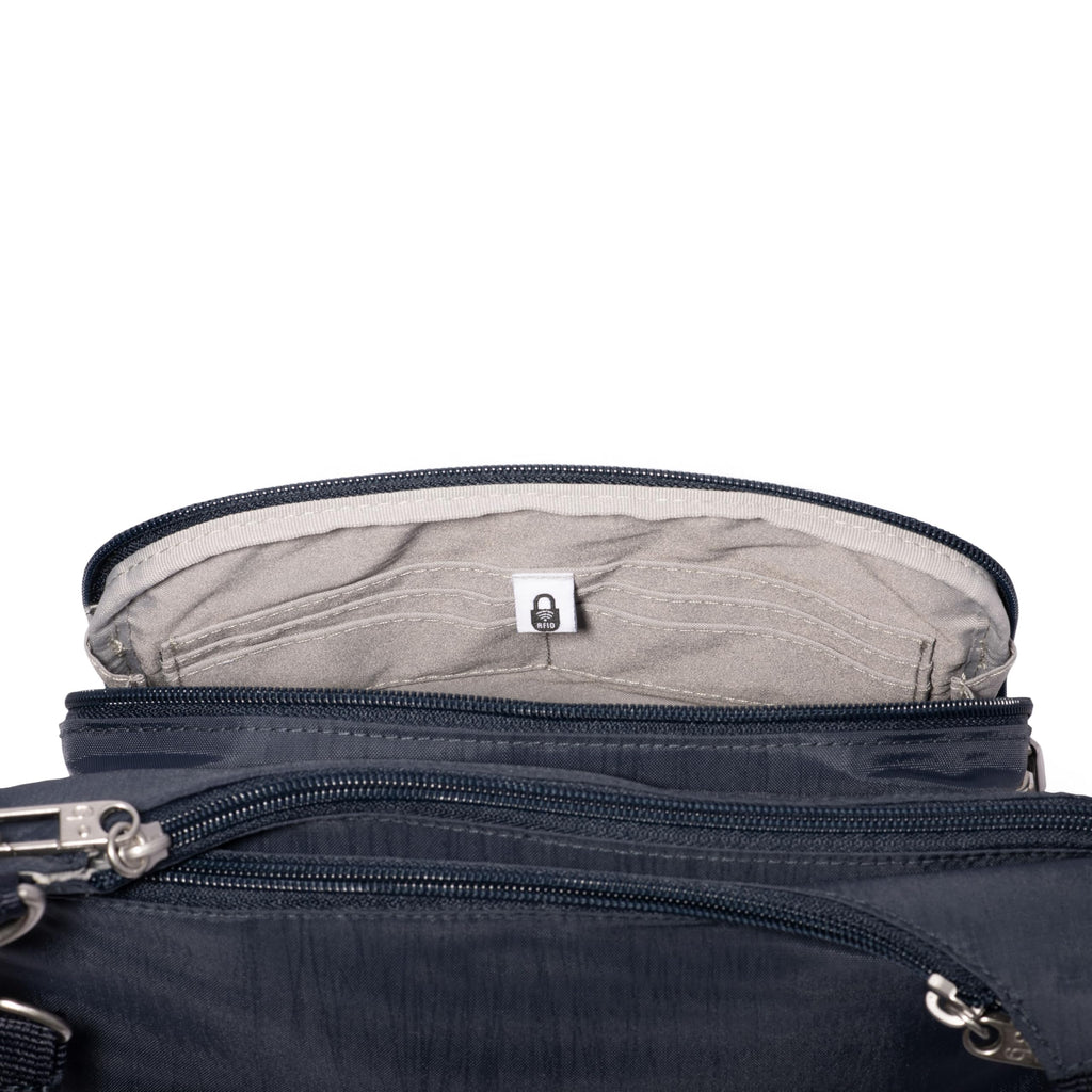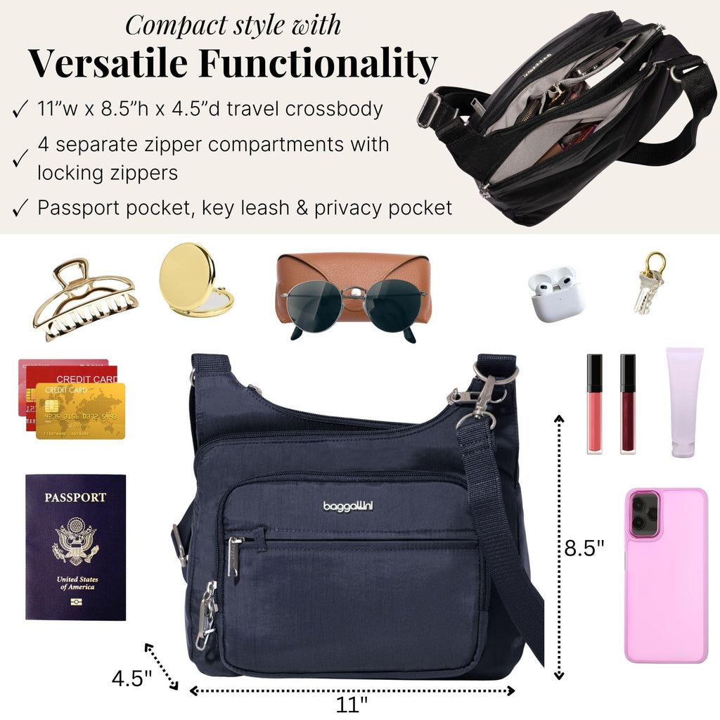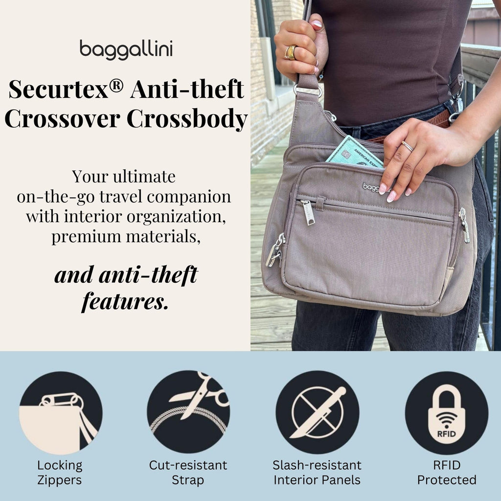 Baggallini Securtex Anti-Theft Crossover Crossbody Bag for Travel 11”W x 8.5”H, RFID, Built-in Wallet, Locking Zippers