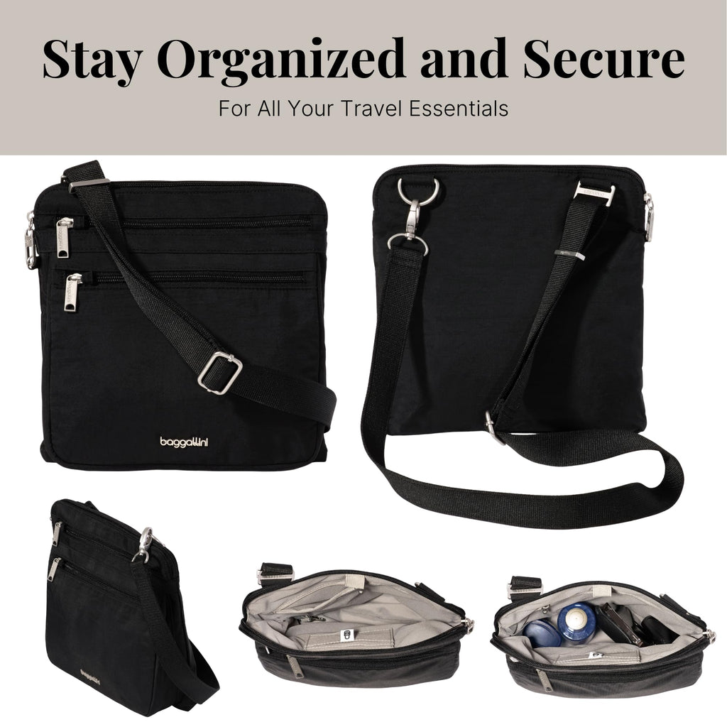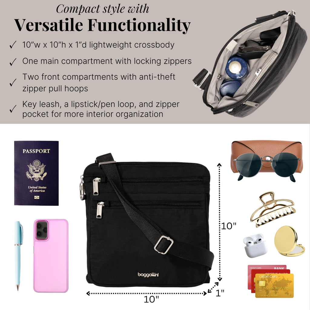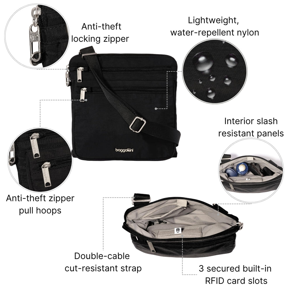 Baggallini Securtex Anti-Theft Large Crossbody 10"x10" Travel Purse with RFID, Locking Zippers & Cut-Resistant Strap