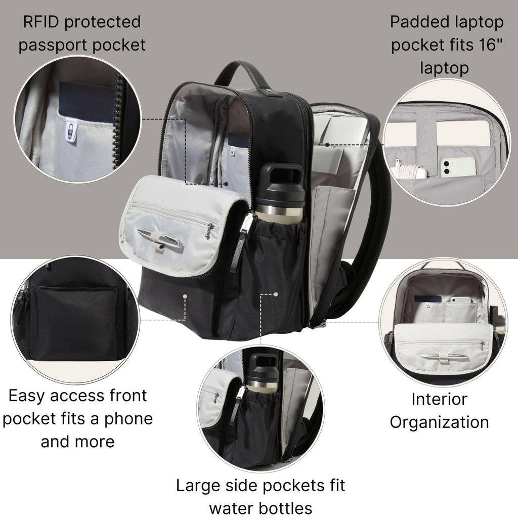 Designed for modern travel, commuting, and everyday organization, the Tribeca Expandable Laptop Backpack combines smart security features, lightweight comfort, and versatile storage in a sleek everyday design. Whether you're heading to the office, catching a flight, or navigating a busy commute, this lightweight laptop backpack keeps your tech, travel essentials, and personal items organized and protected. Measuring 11" W x 14.9" H x 7" D (8.5" D expanded) and weighing just 1 lb 6 oz, this compact yet spacious 21.3-liter backpack offers the ideal balance of capacity and portability. The expandable main compartment adds 1.5 inches of extra storage, allowing you to pack more when you need it—perfect for travel days, overnight trips, or carrying additional work gear. The TSA-friendly laptop pocket opens flat for easy airport security screening and fits laptops up to 16 inches, making it a smart choice for business travel, remote work, and daily commuting. Padded protection keeps your computer secure while still allowing quick access during travel. Built with thoughtful travel security features, the backpack includes an RFID-protected passport pocket designed to help block unauthorized scanning of personal information such as credit cards and passports. This added protection makes it ideal for international travel, airports, crowded transit stations, and city commuting. Inside, multifunctional interior pockets keep your essentials organized, including compartments for chargers, notebooks, pens, and travel accessories. Large side pockets fit water bottles, while the locking luggage sleeve slides securely over rolling luggage handles, allowing for easy airport navigation. When not traveling, the sleeve converts into an additional storage pocket for everyday use. Comfortable adjustable backpack straps (24"–31") allow you to customize the fit for all-day wear, whether you're commuting, walking through the airport, or exploring a new city. Perfect as a laptop backpack for work, commuter backpack, business travel backpack, carry-on personal item bag, or everyday tech backpack, the Tribeca Expandable Laptop Backpack delivers smart organization, travel security, and lightweight versatility for professionals and frequent travelers alike. If you're looking for a lightweight expandable laptop backpack with RFID protection, TSA-friendly laptop access, and travel-ready organization, the Tribeca backpack is designed to keep you organized wherever the day takes you.