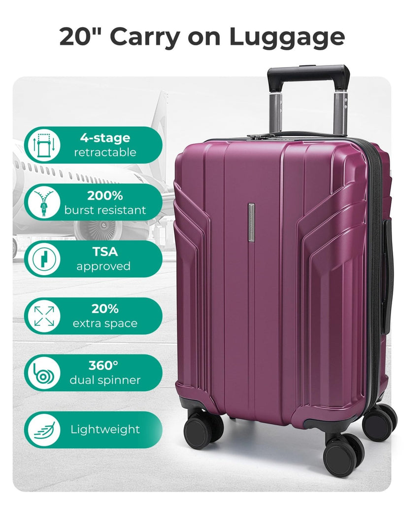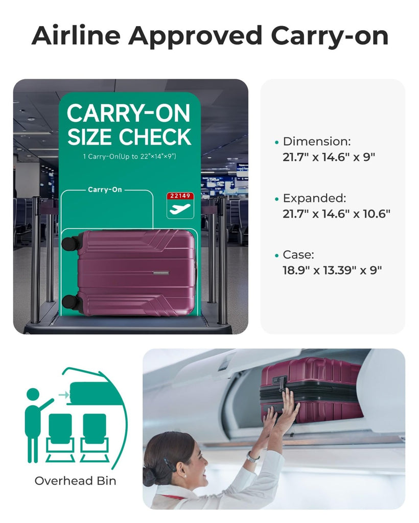Brand: BAGSMARTColor: Purplish RedFeatures: Airline Approved Luggage - Dimensions: 22 x 14 x 9 inches (including wheel and handle height), Volume: 35 L and weighing only 6.83 lbs. The 22 x 14 x 9 carry-on luggage is designed to meet the carry-on limitations of most major airlines worldwide. It fits...