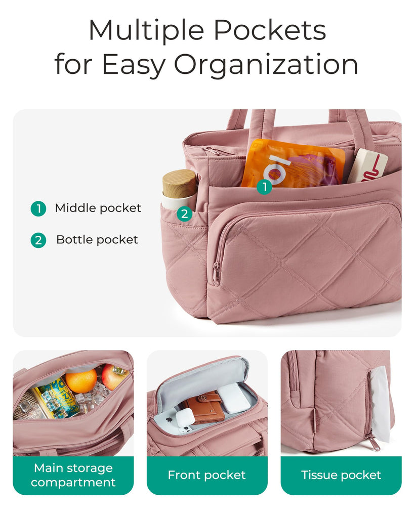 - Multiple Pockets: This lunch tote bag for women has 1 main insulated compartment for food that needs to be kept warm or fresh; 1 middle pocket with large capacity; 1 front zipper pocket for small items; 1 bottle pocket; 1 tissue pocket with a side zip for quick access to tissues