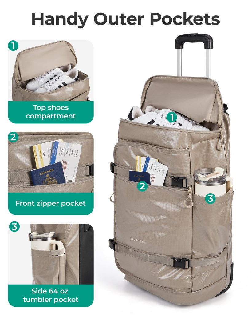 Brand: BAGSMARTColor: GreyFeatures: 3-in-1 Versatile Design: As a rolling duffle bag, a daily tote bag, also a larger tote. Get more space from 30L to 48L by opening the bottom zipper. Transforms from a tote to wheeled carrier in seconds!...