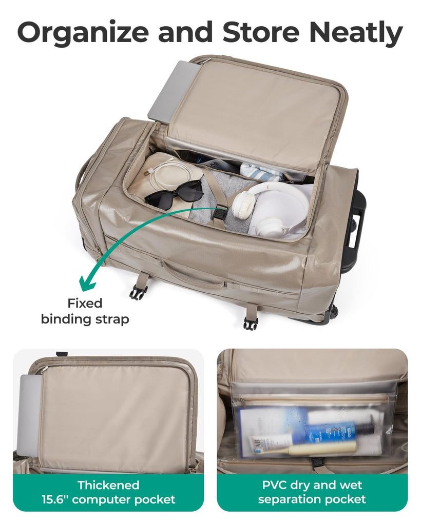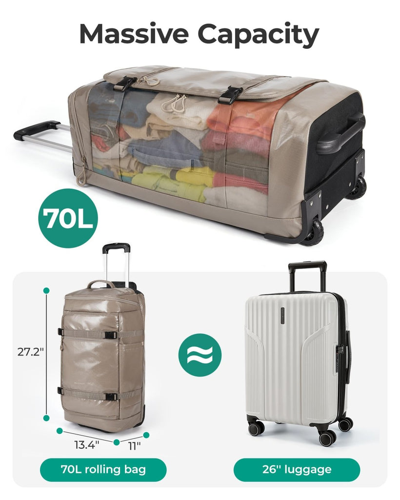 - Built Large, Built Tough: 70L large capacity, 27.2 * 13.4 * 11 inches, comparable to a 26-inch suitcase. Crafted from water-resistant, tear-proof material, this large rolling duffle bag is designed to handle rough travel, outdoor trips, and years of frequent use