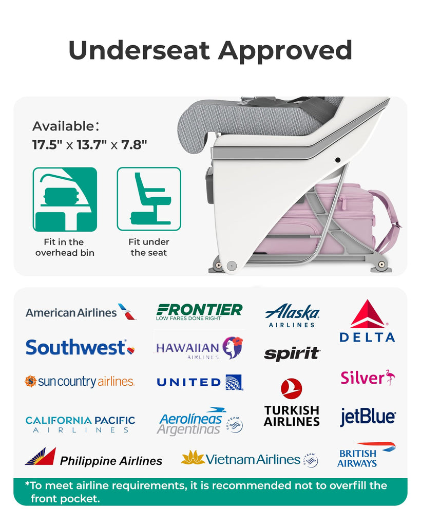 - Airline-Approved: This rolling underseat luggage complies with the personal item size requirements of most airlines, it would easily and comfortably fit under an airplane seat while maintaining convenient accessibility. Making it an ideal travel companion for avoiding the hassle of check-in queues. Dimensions: 17.5×13.7×7.8 inches