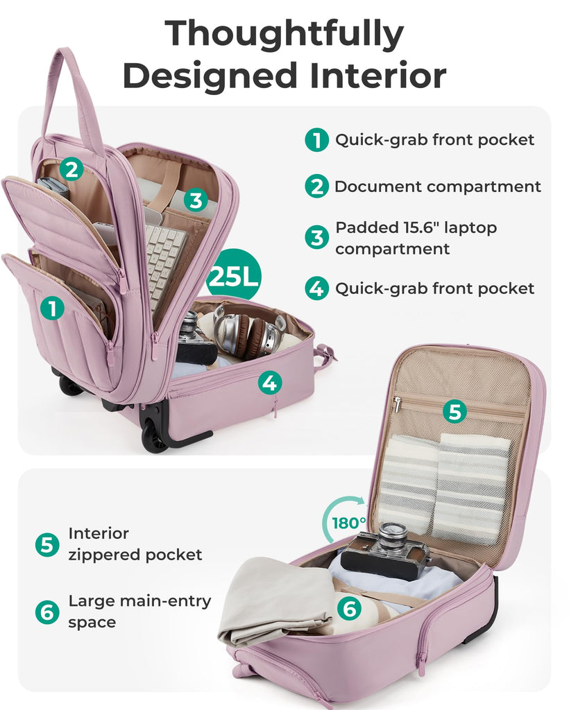 - Organized Storage: Effortless organization is achieved with ample storage, internal compartments, and a small zippered pocket for smaller items. The padded laptop compartment fits up to a 15.6-inch laptop. Making it an ideal carry-on for 2-3 day overnight trips.