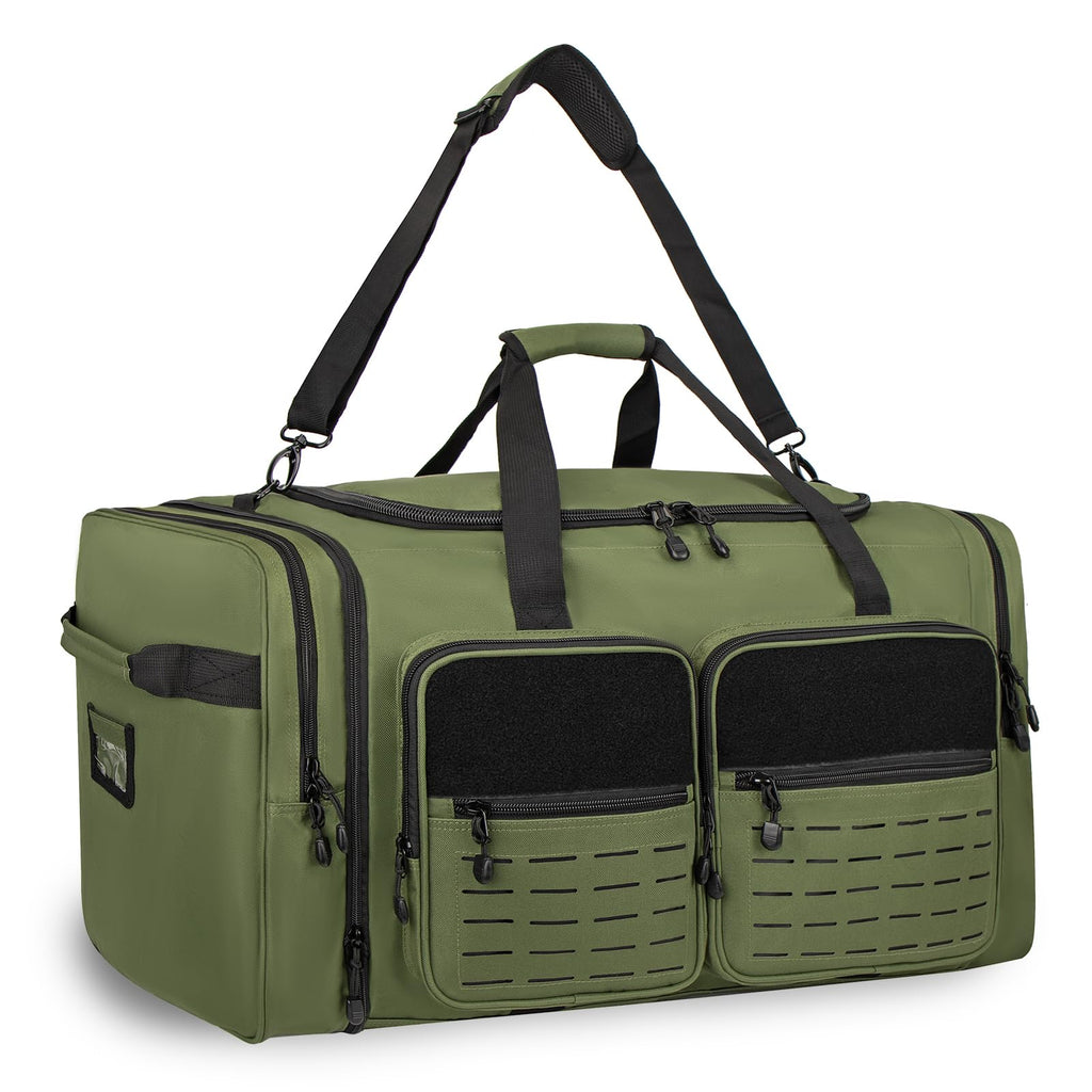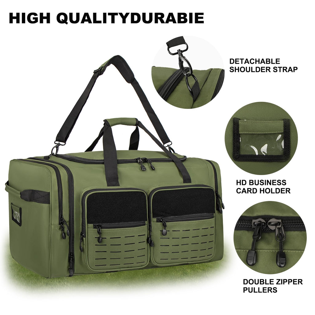- MULTI-SCENARIO USE:Equipped with a side name card holder and front Velcro DIY panel, this bag allows quick gear identification. Integrated Molle webbing easily attaches keys, water bottles, tool pouches and other accessories, saving internal space for on-the-go access. More than a multi-functional gear bag, it is a reliable daily companion that doubles as a tactical duffle bag or travel duffle bag, capable of storing 3-5 days' worth of clothes