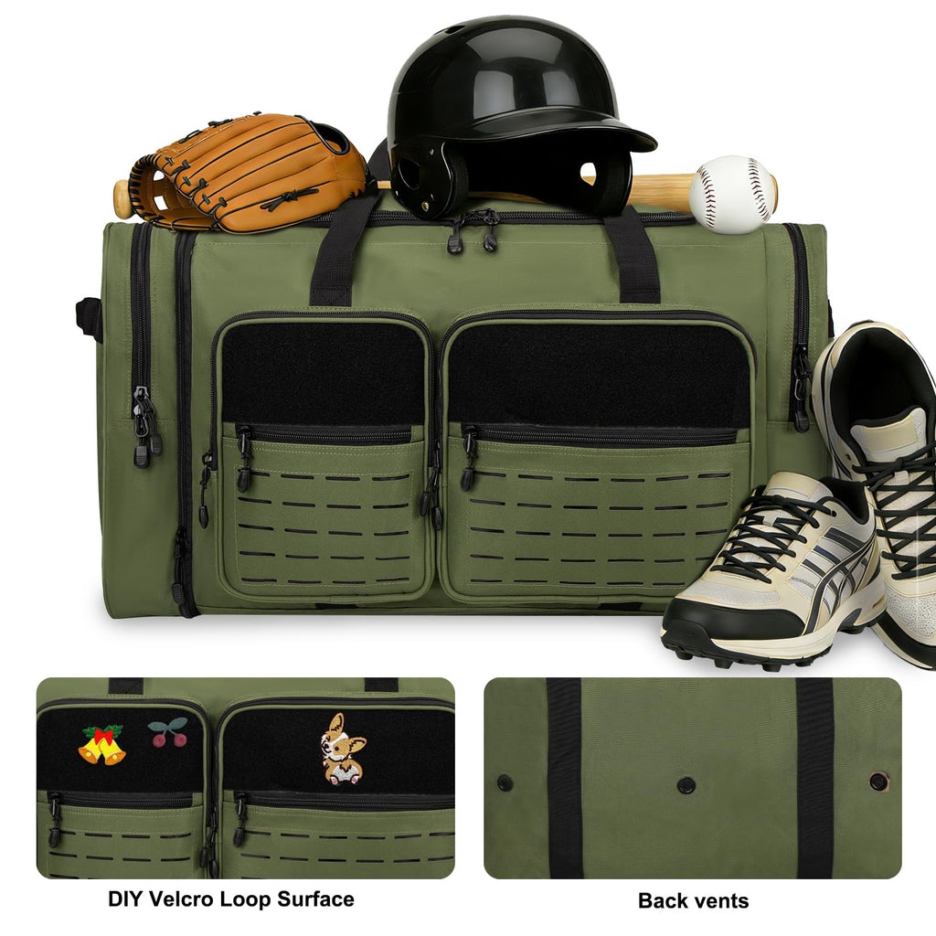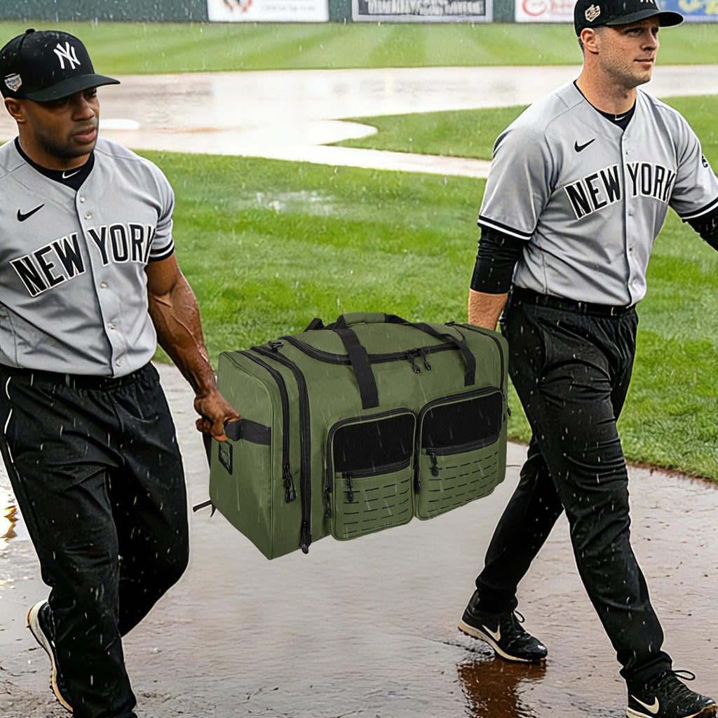 - MULTI-COMPARTMENT:This large duffle bag has a 7-compartment layout: a roomy divider-free main compartment for bulky/irregular items, 4 zippered front pockets for phones/towels, and 2 oversized side pockets for shoes/gear. Three back vents eliminate odors, ideal as a baseball coaches bag for sweaty or damp items