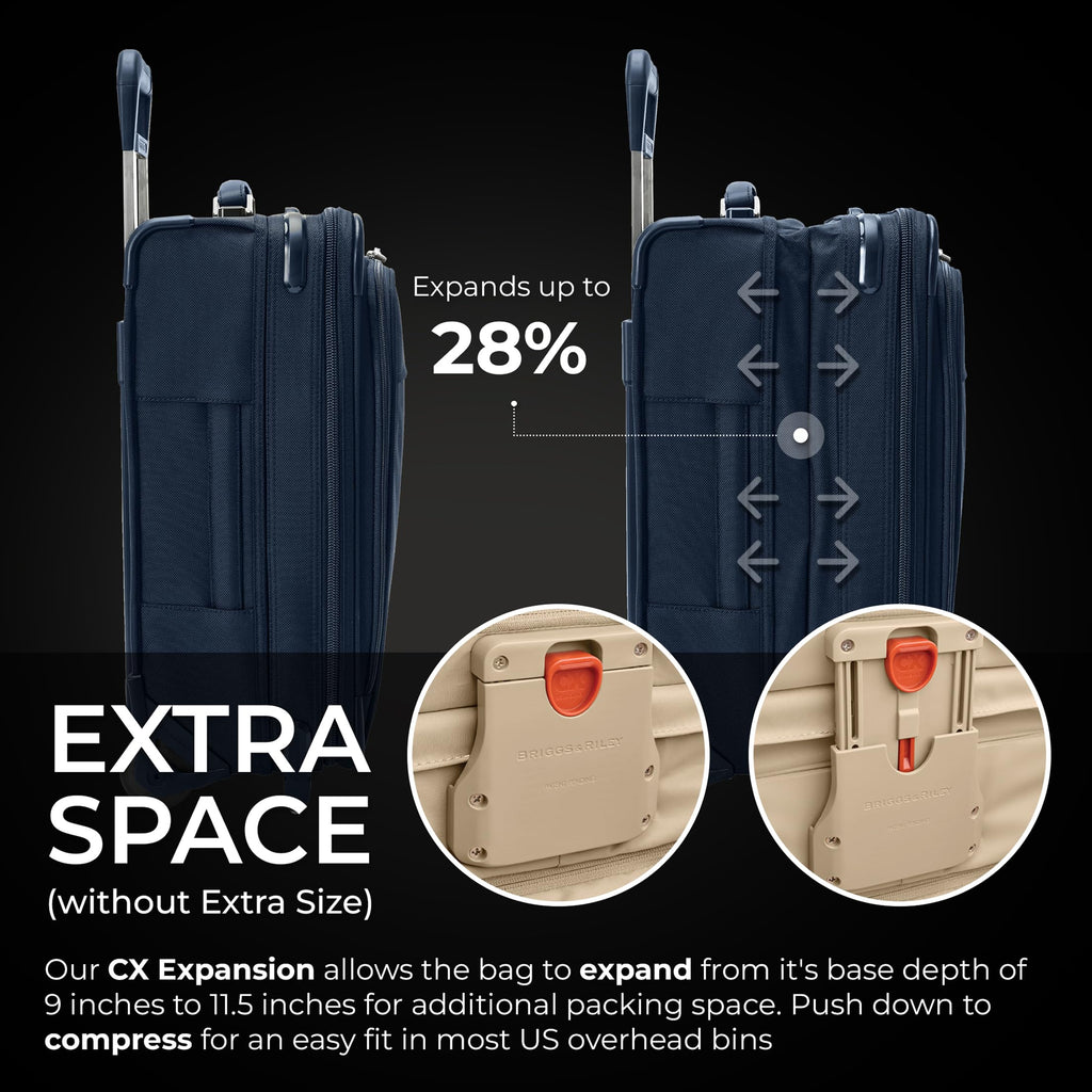 Brand: Briggs & RileyColor: NavyFeatures: DOMESTIC CARRY-ON LUGGAGE - Measuring 22" x 14" x 9-11.5", this expandable packing system enlarges to become astonishingly roomy, then compresses to easily fit most US overhead bins 360 SPINNER WHEELS - Move smoothly in any direction with four shock-absorbing spinner wheels that provide a...