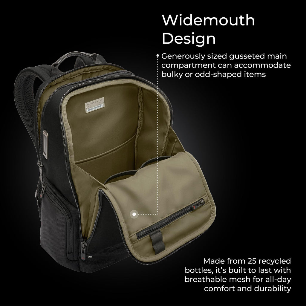 Briggs & Riley Medium Widemouth Backpack - Carry On Travel Backpack for Women & Men, Personal Item Bag, Self-Repairing Zippers, Padded Straps, Fits up to 15.6" Laptop - HTA Collection, Black
