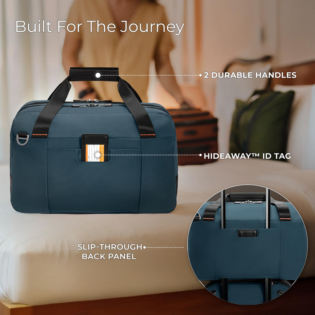 - THOUGHTFUL DETAILS - Enjoy stackable two-in-one transport with a slip-through back panel that slides over any luggage handle, as well as a hide-away ID tag and adjustable shoulder strap
