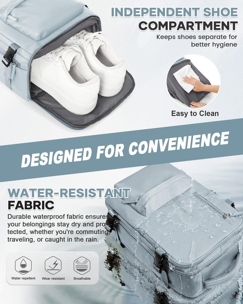 - 【Separate Shoe Compartment Design & Wet Bag】 Main pocket x 2, laptop compartment x 2 (suitable for 13 "tablet and 14" laptop respectively), The wet bag is made of high density water resistant material can help you to separate dry items and wet items, if you have wet clothes or towel, you can put it in the wet bag. A separate shoe compartment can help you carry and keep your shoes better in your travel bag.