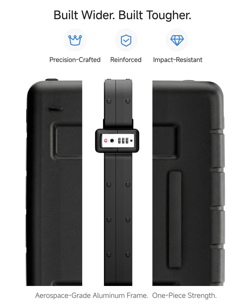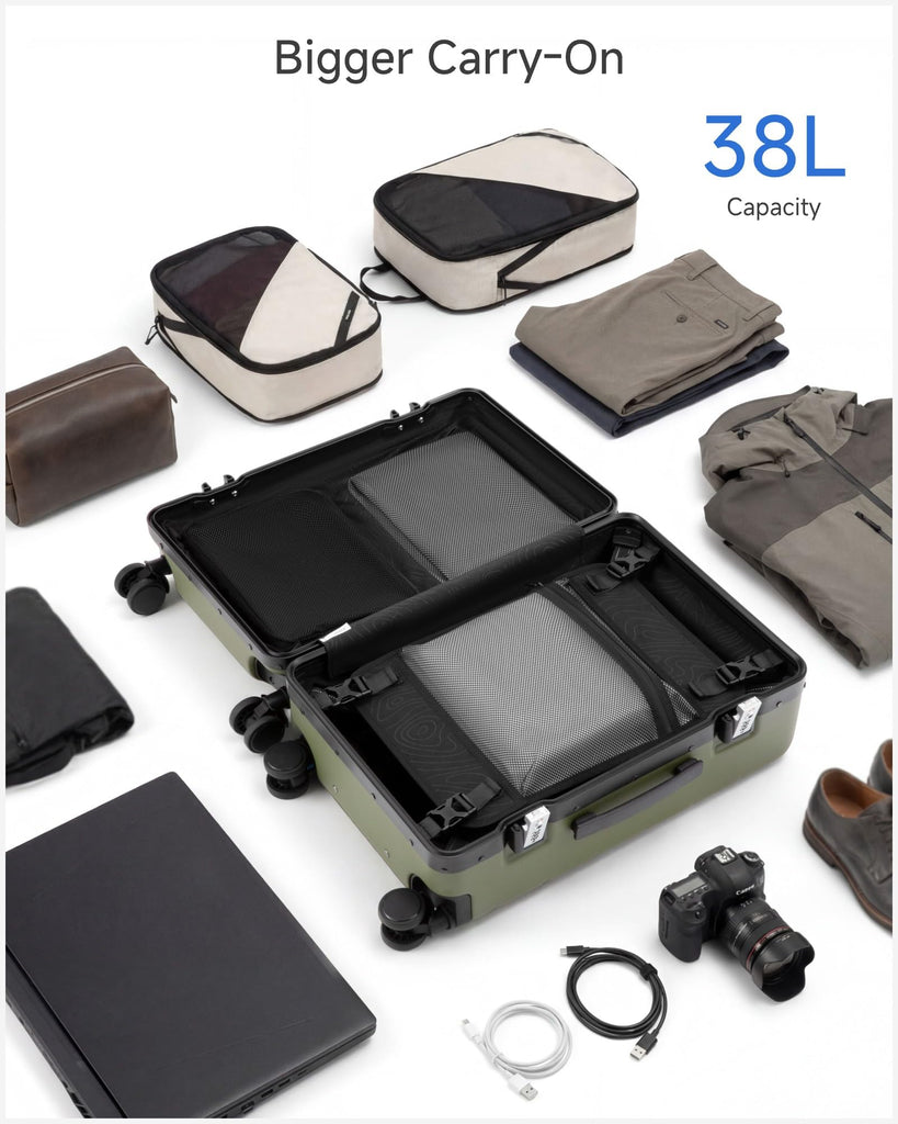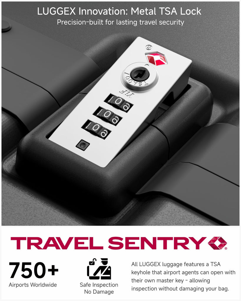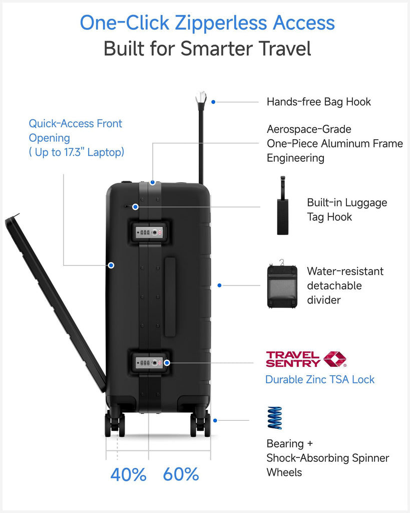 - Durability with Aluminum Frame & PC Shell - Built to withstand the toughest travel conditions. Featuring impact-resistant polycarbonate shell reinforced with a wide aluminum frame, this carry-on offers 40% better shock absorption. The corner-less design minimizes damage, while the TSA-approved lock ensures your belongings stay secure.