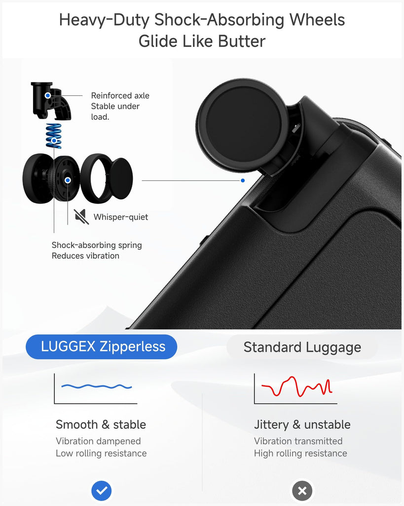 - Ultra-Smooth 360° Spinner Wheels with Shock Absorption - Glide effortlessly through airports with our 8-bearing silent spinner wheels. The advanced shock absorption system handles uneven surfaces smoothly, from cobblestone streets to airport carpets. Detachable wheels make replacements easy, and the ergonomic telescopic handle provides comfortable pulling.