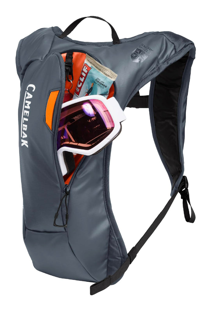 Brand: CamelBakColor: Grey/Orange 2.0Features: Crux Reservoir: 70oz capacity with ergonomic handle and on/off lever for easy refills and leak prevention Therminator Harness: Insulated sleeve protects the drinking tube from freezing in cold conditions Lift-Friendly Design: Slim, low-profile fit and Lift Access QR Harness for easy access on chairlifts SnowShield Fabric:...