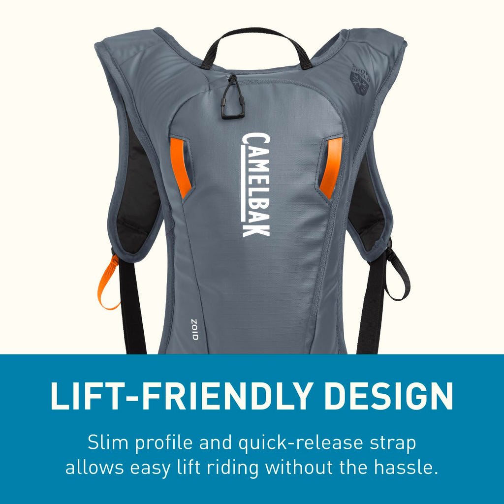 Details: The CamelBak Zoid is the ultimate minimalist snow hydration pack, redesigned for lift-friendly performance and winter-ready durability. Featuring a 70oz Crux Reservoir with an ergonomic handle and on/off lever, the Zoid keeps hydration flowing with the Therminator Harness, which insulates the drinking tube to prevent freezing. Its ultra low-profile design fits comfortably under or over layers and is optimized for chairlift rides with the Lift Access QR Harness, allowing quick access to essentials. Built with Snow Shield materials to repel snow and moisture, the Zoid also includes a secure zippered pocket, adjustable sternum strap, and a slim silhouette that won’t get in the way of perfect powder laps.