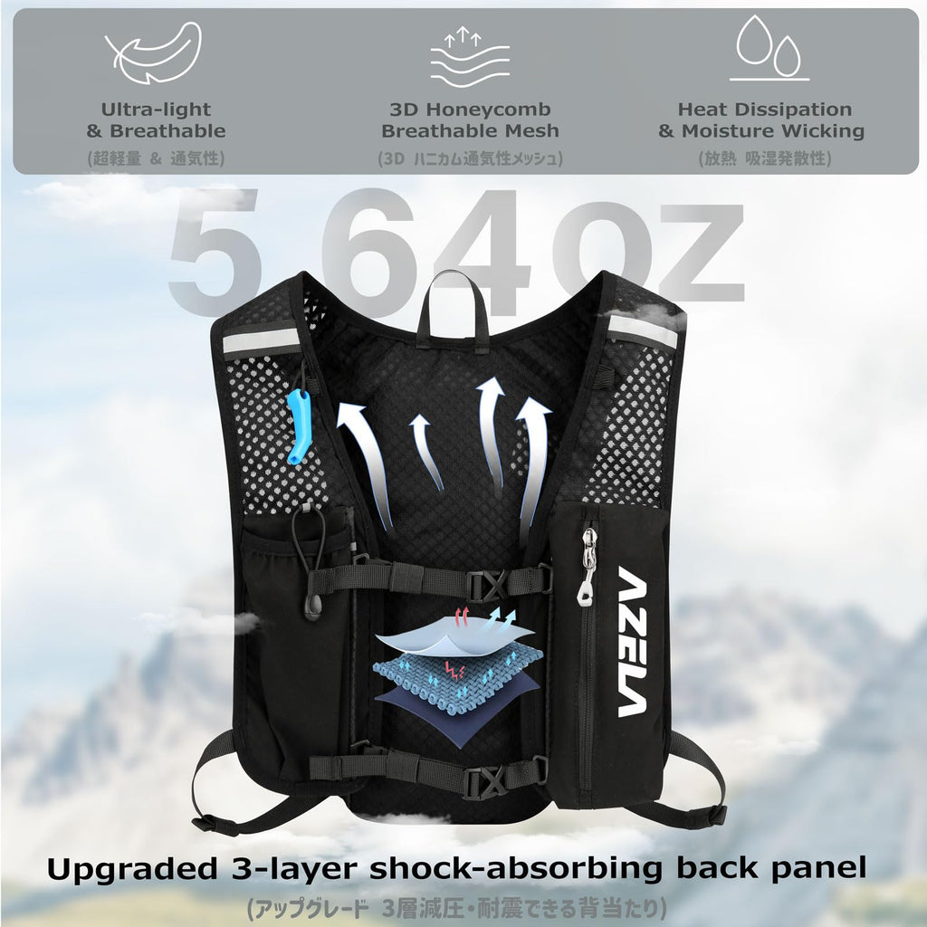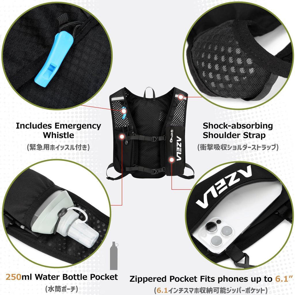 - Durable & Safe: Made with water-resistant nylon, premium zippers, and secure fasteners, this hydration backpack offers lasting durability. Reflective strips and a safety whistle enhance visibility and safety during morning/night runs and trails