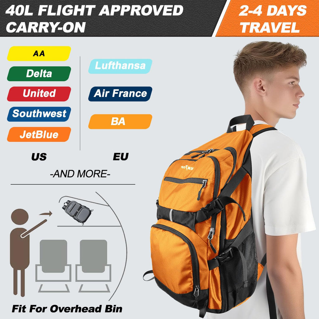Seektop 40L Foldable Hiking Backpack for Women Men Lightweight Packable Travel Backpack Carry on Flight Approved for Outdoor Camping Sport Leisure (Orange)