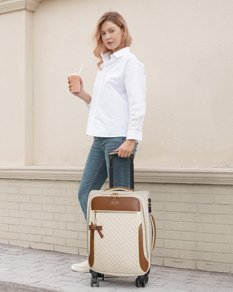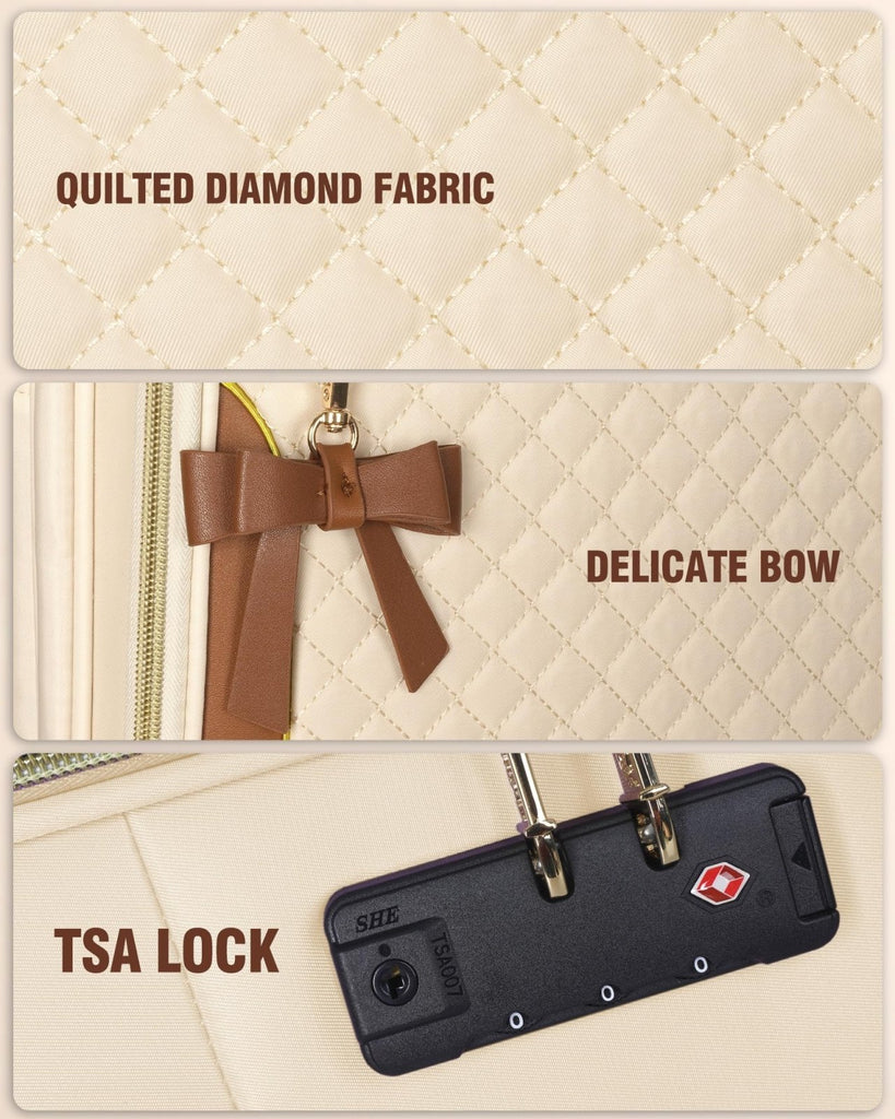 - TSA LOCK & STRIKING VISIBILITY: This 20 inch carry on luggage features a built-in TSA-approved combination lock keeps belongings secure. Crafted from tough polyester fabric that withstands airport handling. This suitcase comes with a bow decoration, make it stand out on luggage carousel, easier to find