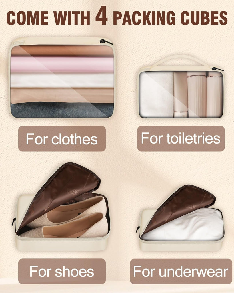 Brand: TagerTrekColor: Light BeigeFeatures: EXTRA LARGE STORAGE: This carry on luggage comes with 4 packing cubes - 2 clear for clothes and toiletries, 2 opaque for underwear and shoes. Main compartment has a water-resistant area for unwashed clothes or other items. No need to rummage through all looking for one...