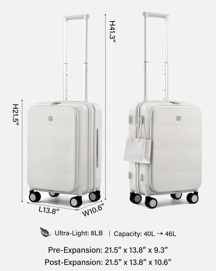 - Expandable Luggage Overall Dimension: Hanke 20 inch carry on luggage measures - expands from 21.5” x 13.8” x 9.3” to 21.5” x 13.8” x 10.6” (including wheels and handles), weight at just 8 lbs. Packing Capacity: expands from 40L to 46L. Ideal as an international carry-on suitcase for weekender trips or business travel – no checked baggage needed
