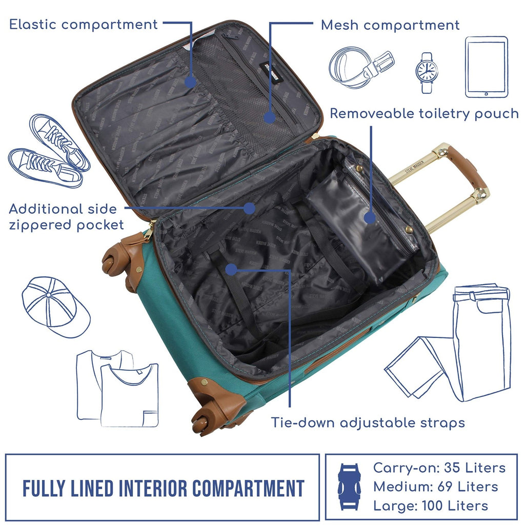 - ✈️ BUILT FOR TRAVEL; Travel lighter than ever with Steve Madden's Expandable Luggage; The softside design can collapse a bit to fit more easily into tight spaces (compared to hardside); The lightweight construction helps you adhere to airline weight restrictions and avoid unneeded airport fees which make it best suitcase for domestic and international travel