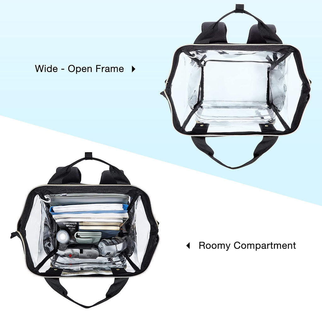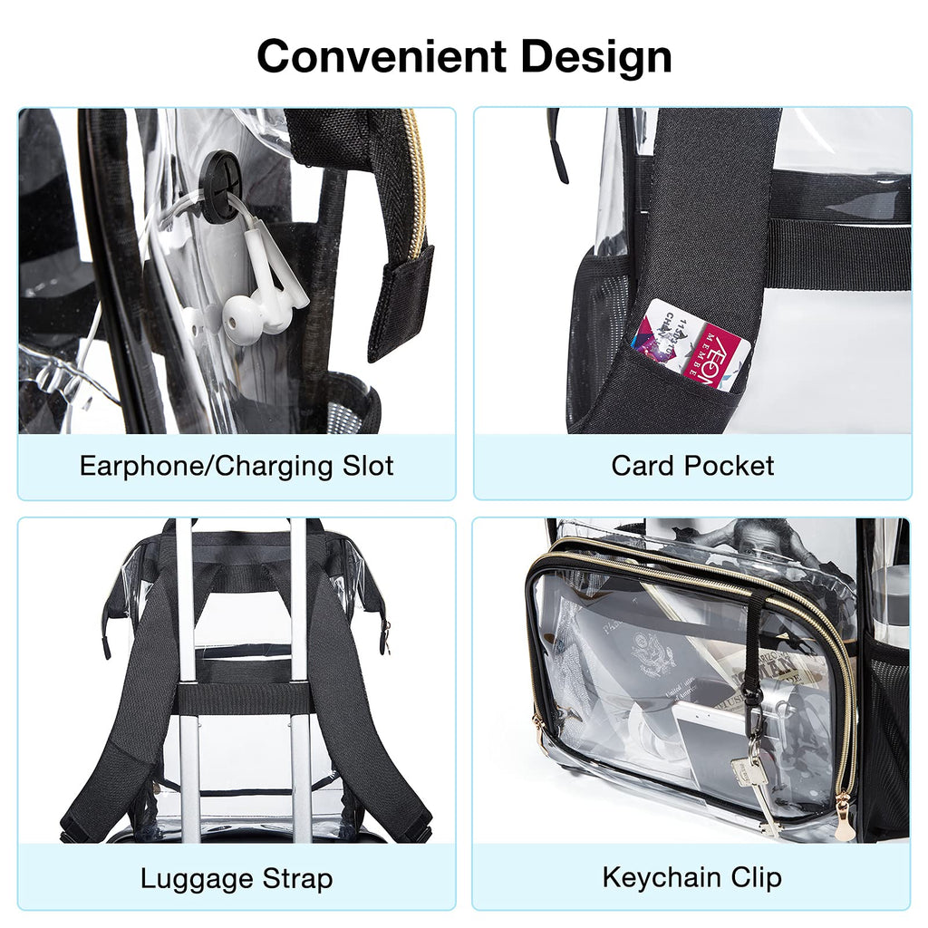 - Convenient See-through Bookbag- Designed with a built-in keychain clip, a charging/earphone slot for handy charging and listening to music, a card pocket on the shoulder strap to store your metro card, etc. An ideal clear backpack combines style with function.