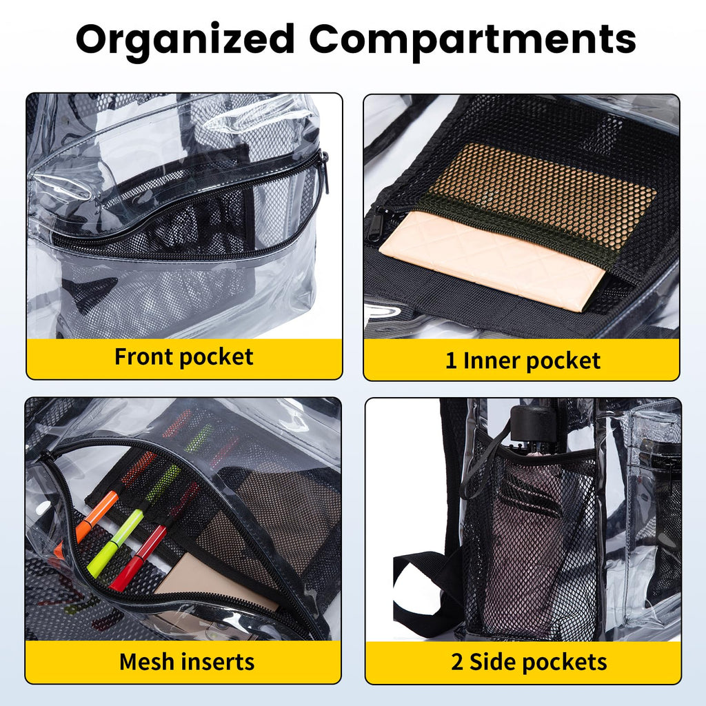 - Multipurpose Use: You can use this see-through backpack for multi-occasions such as colleges, workplaces, sporting events, concerts, camping, beaches, airports, and travel. It's roomy enough to store all the necessities
