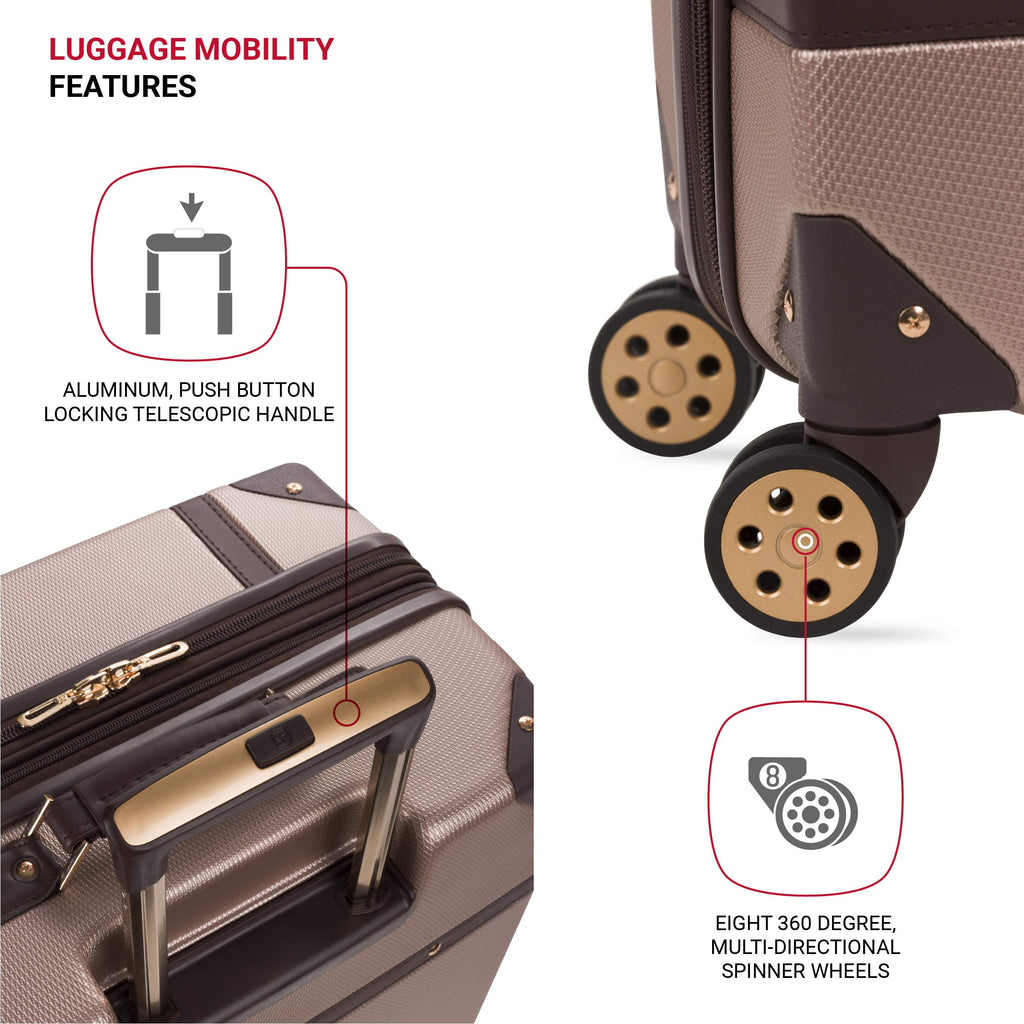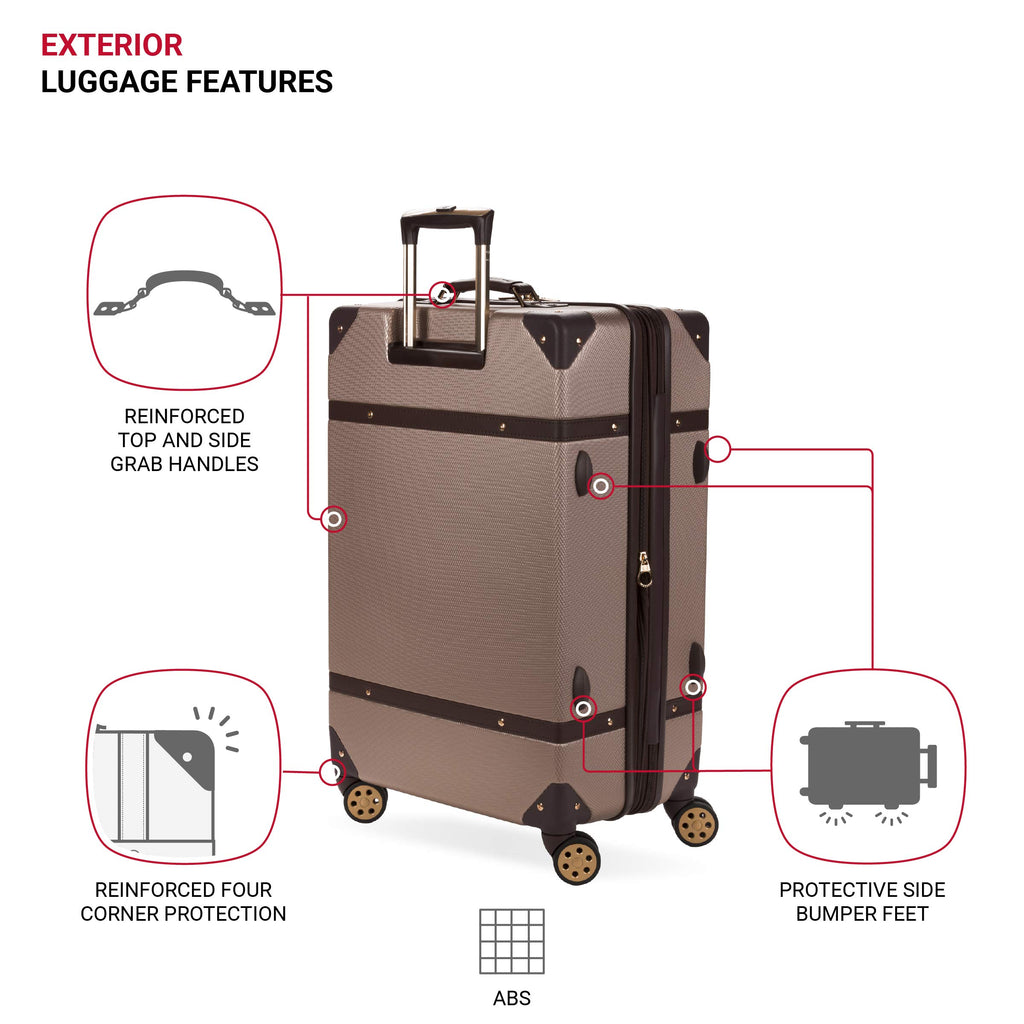 Brand: SwissGearColor: BlushFeatures: 360-DEGREE SPINNER MANEUVERABILITY: Constructed with 8 premium spinner wheels and a locking retractable handle, take advantage of its easy pushing and pulling maneuverability to seamlessly get through a crowded airport or down narrow airplane isles. STYLISH DESIGN WITH MAXIMUM PACKING SPACE: A retro case embellished with accent...