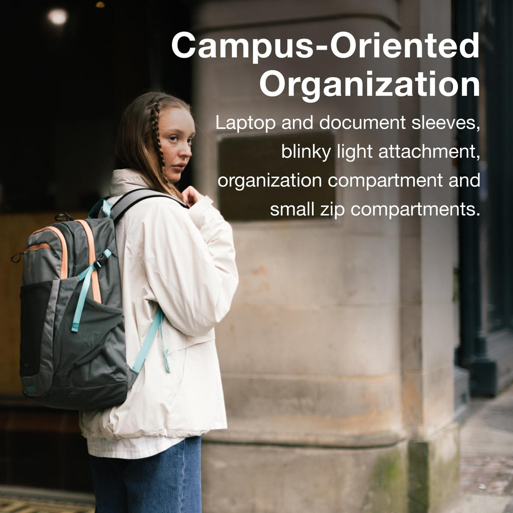 - Campus-Oriented Organization - Laptop and document sleeves (fits most 16-inch laptops), blinky light attachment, organization compartment and small zip compartments