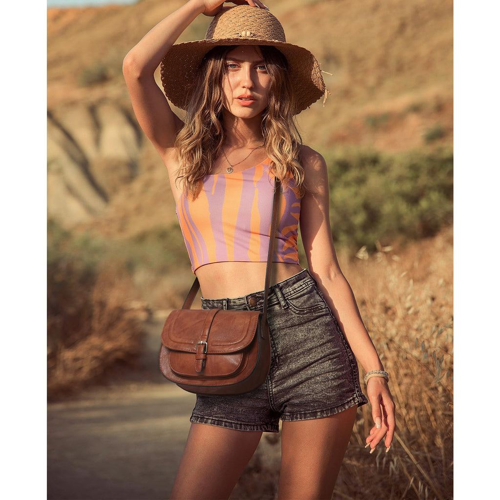 AFKOMST Crossbody Bags for Women,Small Saddle Purse and Boho Cross Body Handbags,Vegan Leather, Brown