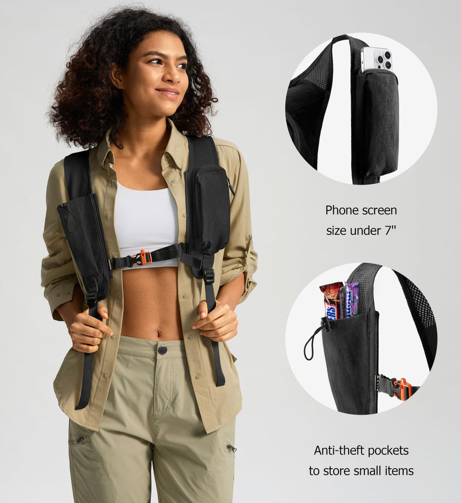 - CELL PHONE POUCH: The zippered pocket on the left shoulder strap will hold a cell phone screen up to 7 inches, and on the other side is an anti-theft pocket with an elastic cord closure, so you can put some items such as a wallet and snacks.