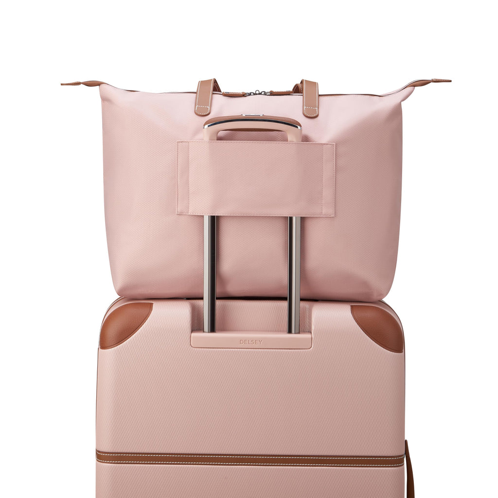 Brand: DELSEY PARISColor: Blush PinkFeatures: Durable, ecofriendly chevron pattern fabric made with recycled water bottles and vegan leather-trim of the stylish iconic Chatelet design Smart band on the back to slide over the tubes of wheeled luggage Interior zippered pocket to provide organzation and store valuables Foldable for easy storage;...