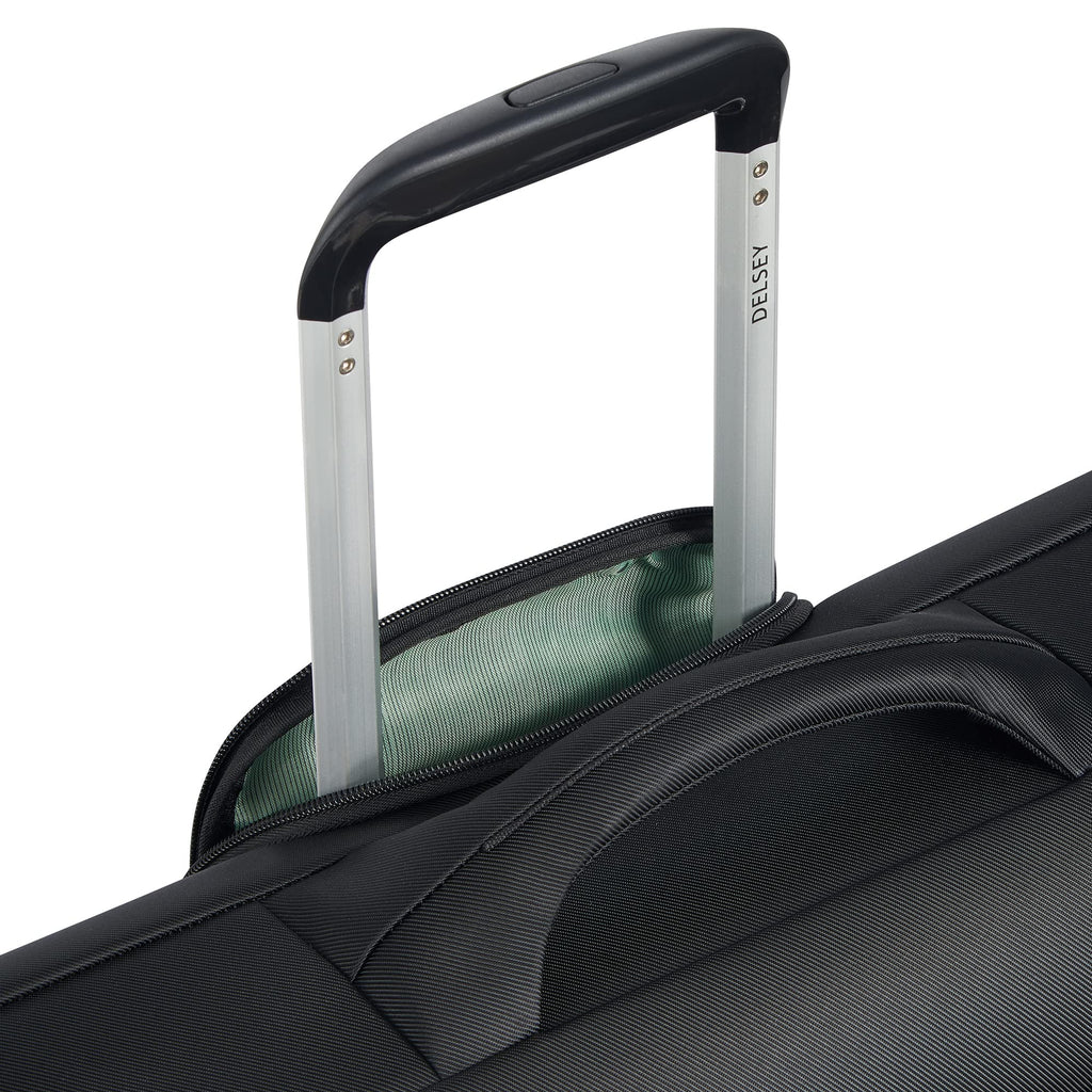 Brand: DELSEY PARISColor: BlackFeatures: Recycled water-resistant canvas Telescoping handle Two durable in-line wheels Large top opening for easy visibility Collapsable for simple storage Carry handles Separate shoe pocket Quick access pocket Tie-down straps Interior mesh pocket Collapsable for storagemodel number:...