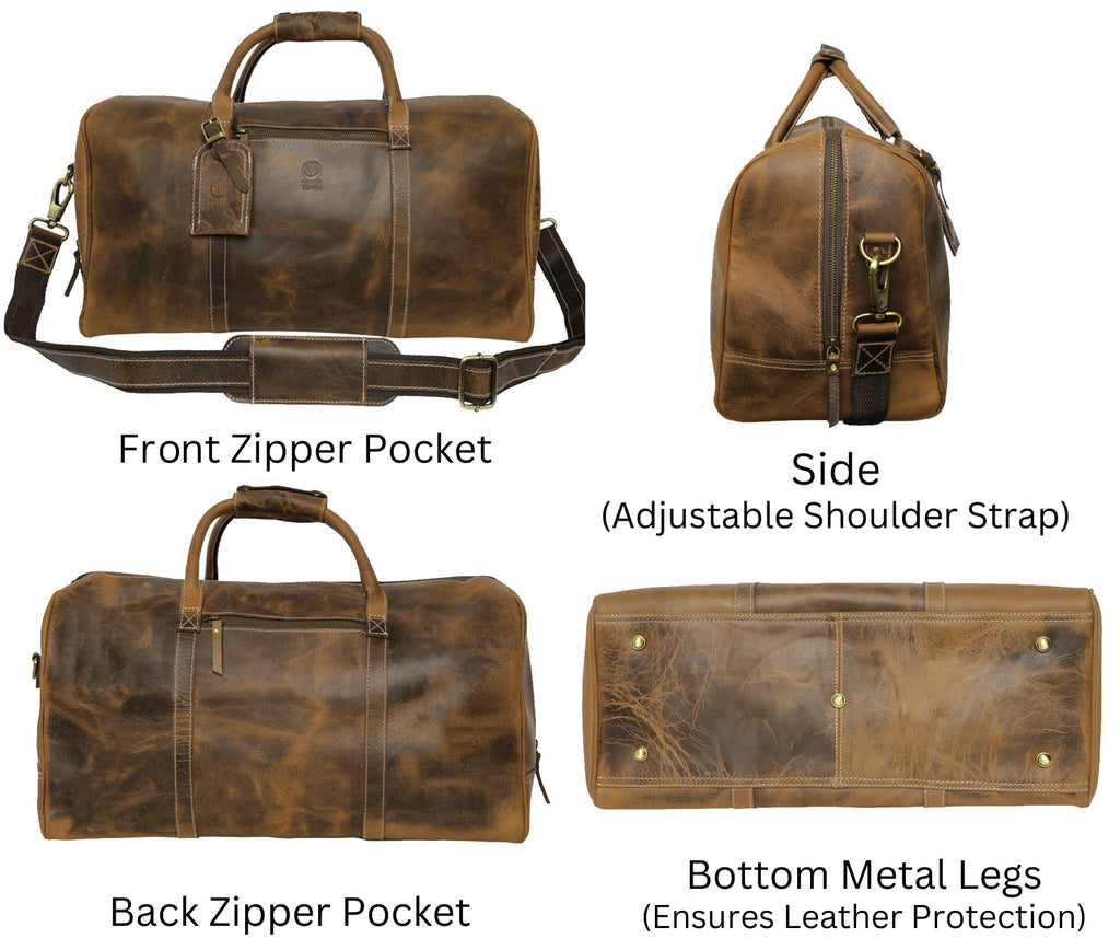 Introducing our premium quality full-grain leather duffle bags for men, meticulously crafted to accompany you on your rugged adventures. Handcrafted by skilled Indian artisans, each travel bag exudes durability & sophistication, making it the ultimate companion for the modern man. Rugged through and through, our TSA approved leather duffle bags boast unparalleled toughness. Constructed from buffalo hide, these bags are built to withstand the test of time. With break-resistant YKK zippers, stout brass fittings, and a thick premium cloth lining, our duffle bags ensure your belongings stay safe and secure. Despite its compact size, our leather weekender bag for men offers ample room for all your gear. Featuring multiple exterior and interior pockets, including dedicated spaces for mobile, cables, & essentials, staying organized on the go has never been easier. From business trips to weekend getaways, our mens leather duffle bag effortlessly accommodates your every need. Designed for convenience, our leather overnight bag features quick access pockets, allowing you to grab your essentials on the fly without missing a beat. Whether you're rushing through airport security or navigating bustling city streets, our travel bag keeps you prepared and stylish at all times. Versatile & practical, our bolsos de viaje de cuero are engineered to fit seamlessly into your lifestyle. From fitting perfectly in overhead compartments to sliding effortlessly under airplane seats, our carry-on luggage bag is tailor-made for air travel. Pack everything you need for a three-day trip with ease, from suits and shirts to shoes and grooming essentials. Elevate your travel experience with our bolsas de lona de cuero para hombres. Embrace the spirit of adventure with a leather travel bag that not only embodies style & durability but also enhances your journey every step of the way. Upgrade to our leather duffle bag today & embark on your next adventure in unparalleled luxury and convenience.