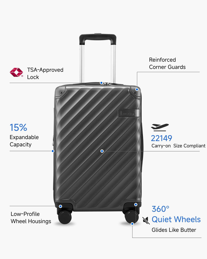Brand: LUGGEXColor: Charcoal MetallicFeatures: Overall Dimensions: 21.5 x 13.8 x 9 IN (Including spinner wheels, handle, accessories, etc.), Weight: 7.5 LB, Capacity: 40L; Interior Dimensions: 18.5 x 13.5 x 8.8 IN. Airline Approved: LUGGEX 20-inch carry-on luggage meets most airlines' 22x14x9 inch size restrictions, Enjoy seamless boarding with no requirement...
