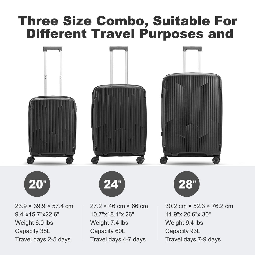 - Explore the convenience of a 3-piece luggage set: This set includes three suitcases in different sizes, including a spacious 28-inch luggage, a versatile carry-on, and an intermediate-sized suitcase. With this variety, you'll have the perfect bag for any trip, whether it's a weekend getaway or an extended vacation.