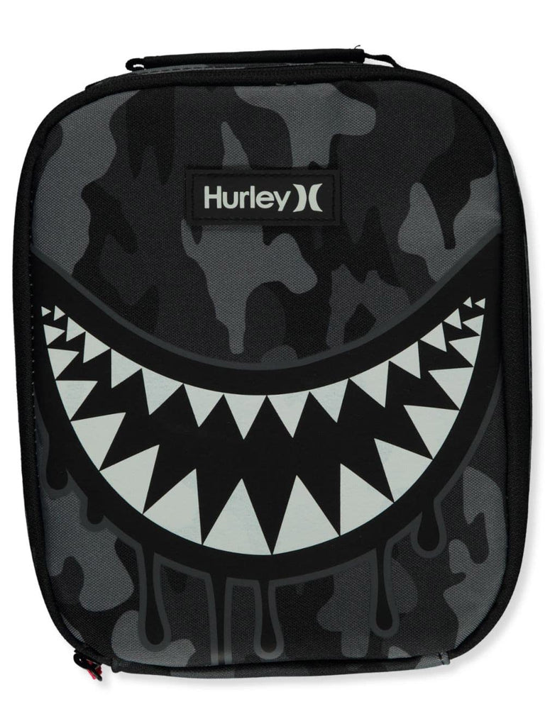 Brand: HurleyColor: Dark Grey Heather CamoFeatures: Durable woven exterior fabric for easy on-the-go storage. A large and intense shark bite graphic covers the front face. Food grade PEVA lining helps keep food warm or cold depending on what's for lunch. Zip-around closure for easy securing. Top handle Dimensions: 8" L...